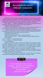 Запрошуються до участі у дистанційному проєкті "Мій світ психології" учні 9 класу. За детальною інформацією звертайтеся до практичного психолога.