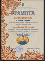 Вітаємо Тетяну Каплун, ученицю 9 класу, із перемогою у міському етапі Всеукраїнського фестивалю дитячої та юнацької творчості "Чисті роси", номінація "театральне мистецтво", "Живе слово". Бажаємо успіхів та натхнення